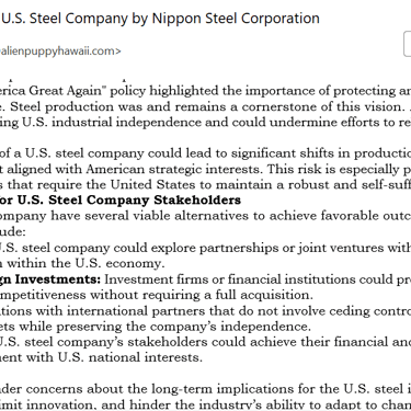 The United States has a proud history of industrial innovation and leadership, particularly in the steel industry. Protecting this legacy requires thoughtful policies and decisions that prioritize American interests, workers, and industries. Denying this acquisition would send a clear message that the United States remains committed to safeguarding its critical industries and national security.