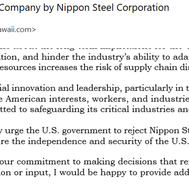 In light of the concerns outlined above, I strongly urge the U.S. government to reject Nippon Steel’s acquisition of the U.S. steel company. This decision would protect American workers, ensure the independence and security of the U.S. steel industry, and align with the principles of economic and industrial resilience.